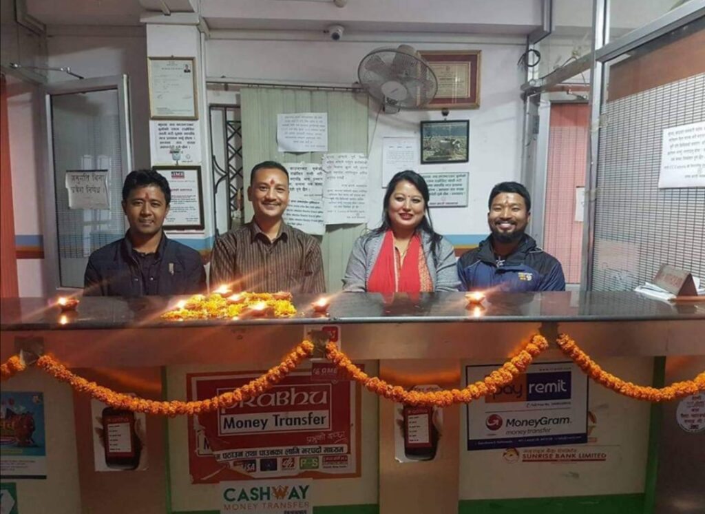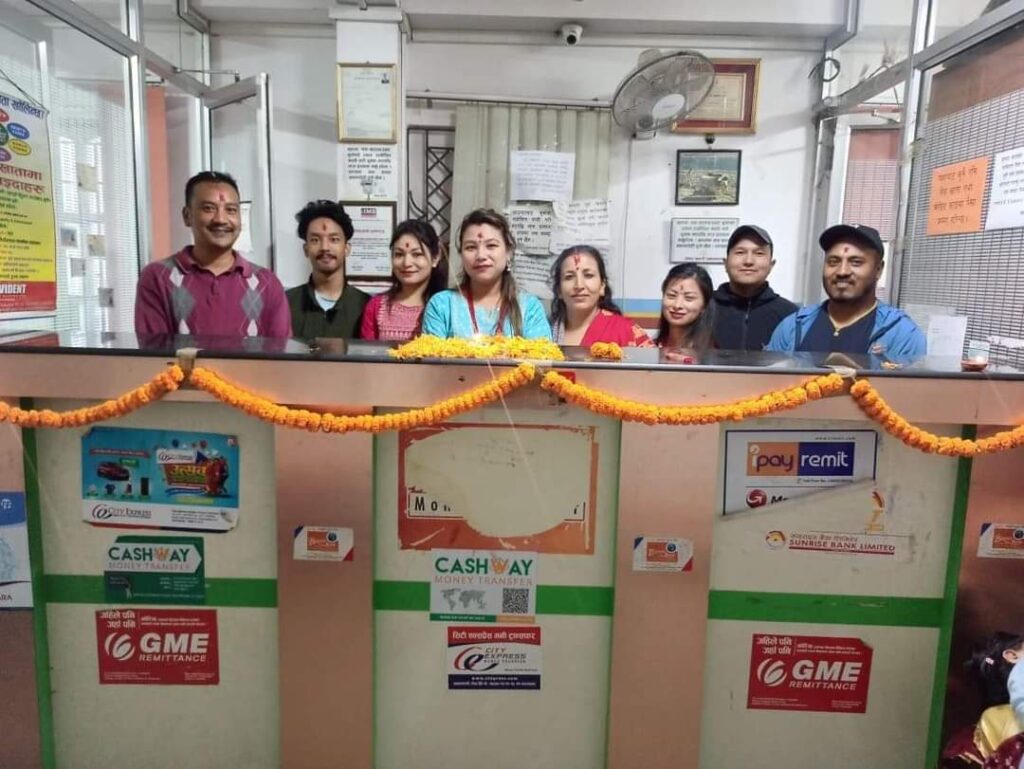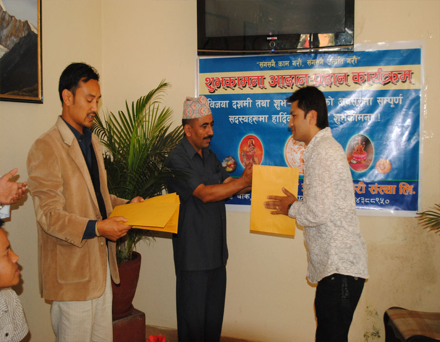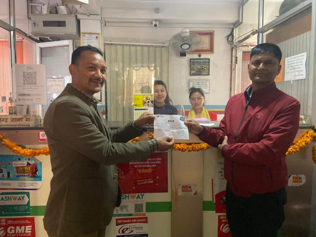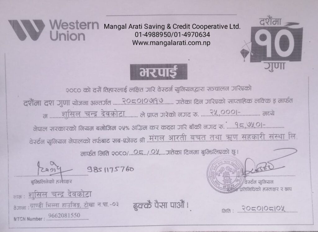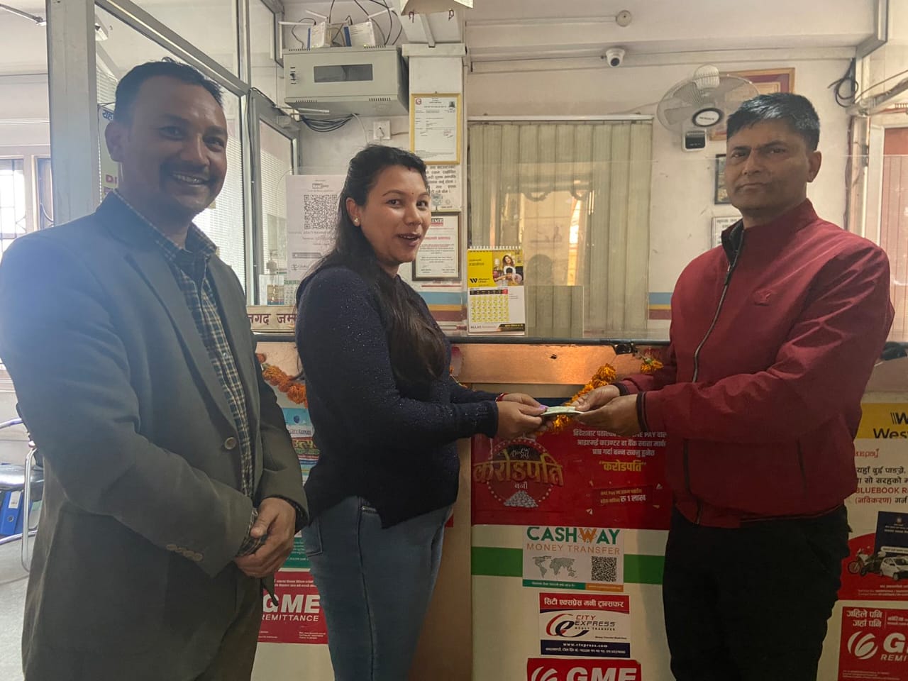 Handing over the cash & receipt to the western union weekly lucky draw winner by Chairman from mangal arati counter.